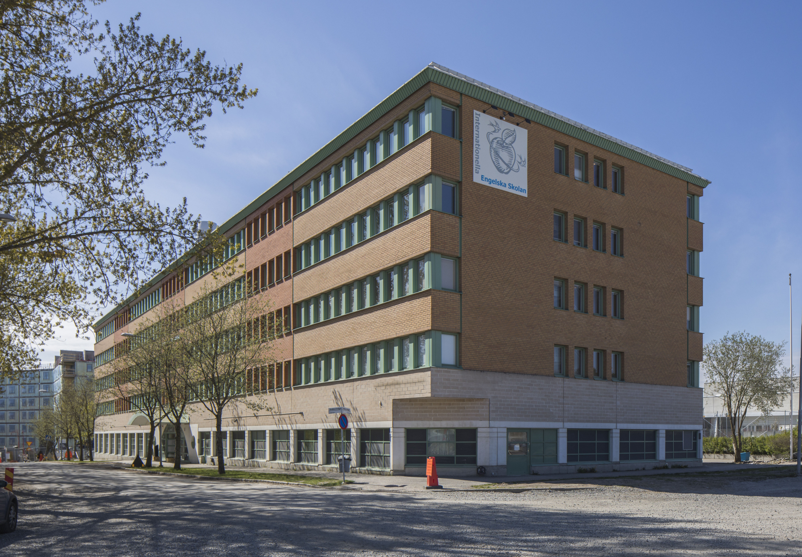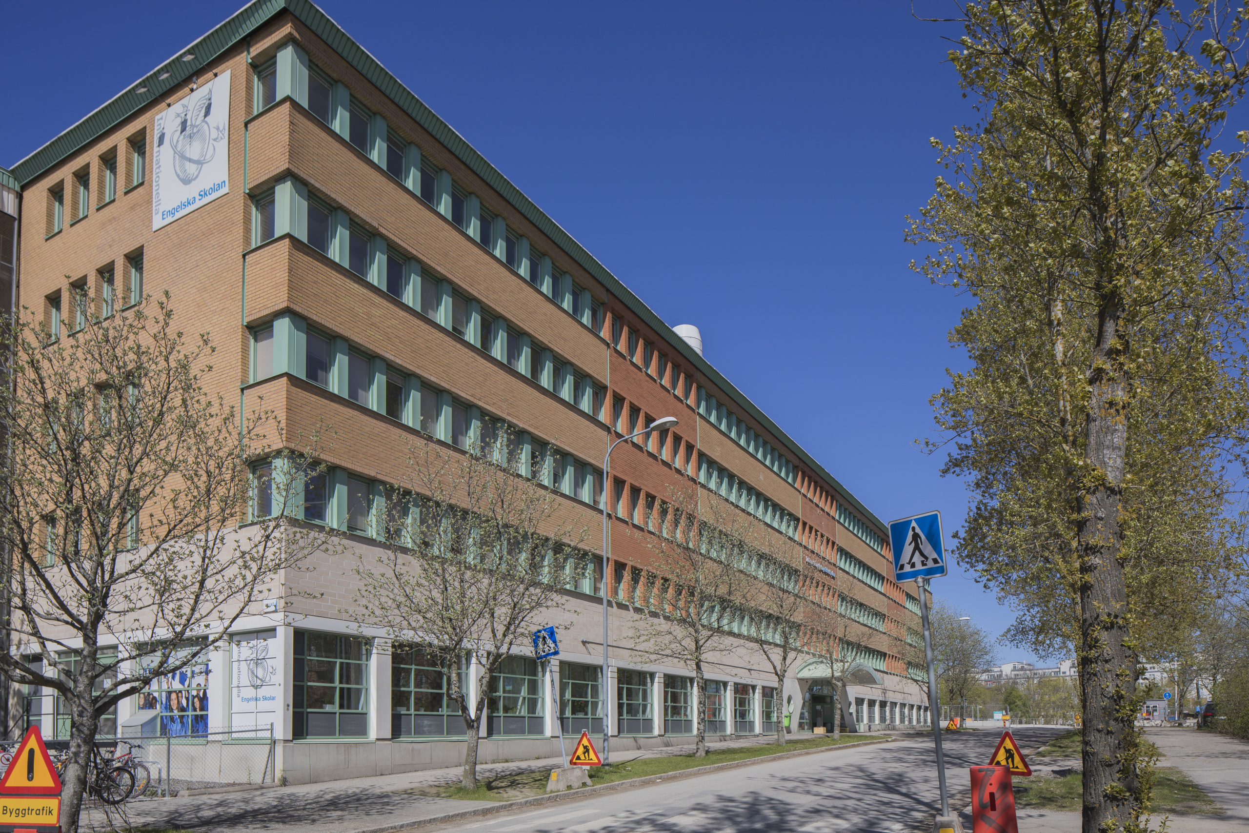 Fastigheten är belägen i ett attraktivt läge i Älvsjö bara 10 minuter från Stockholms city. Det är en modern skolbyggnad med en stor skolgård uppe på taket.