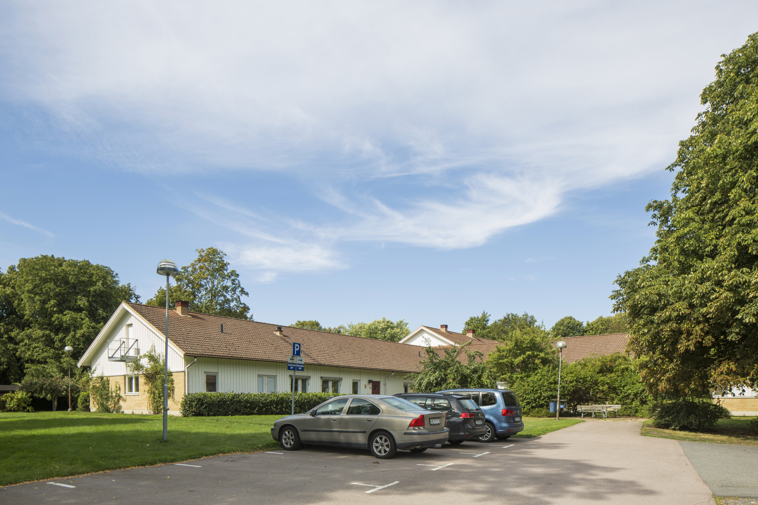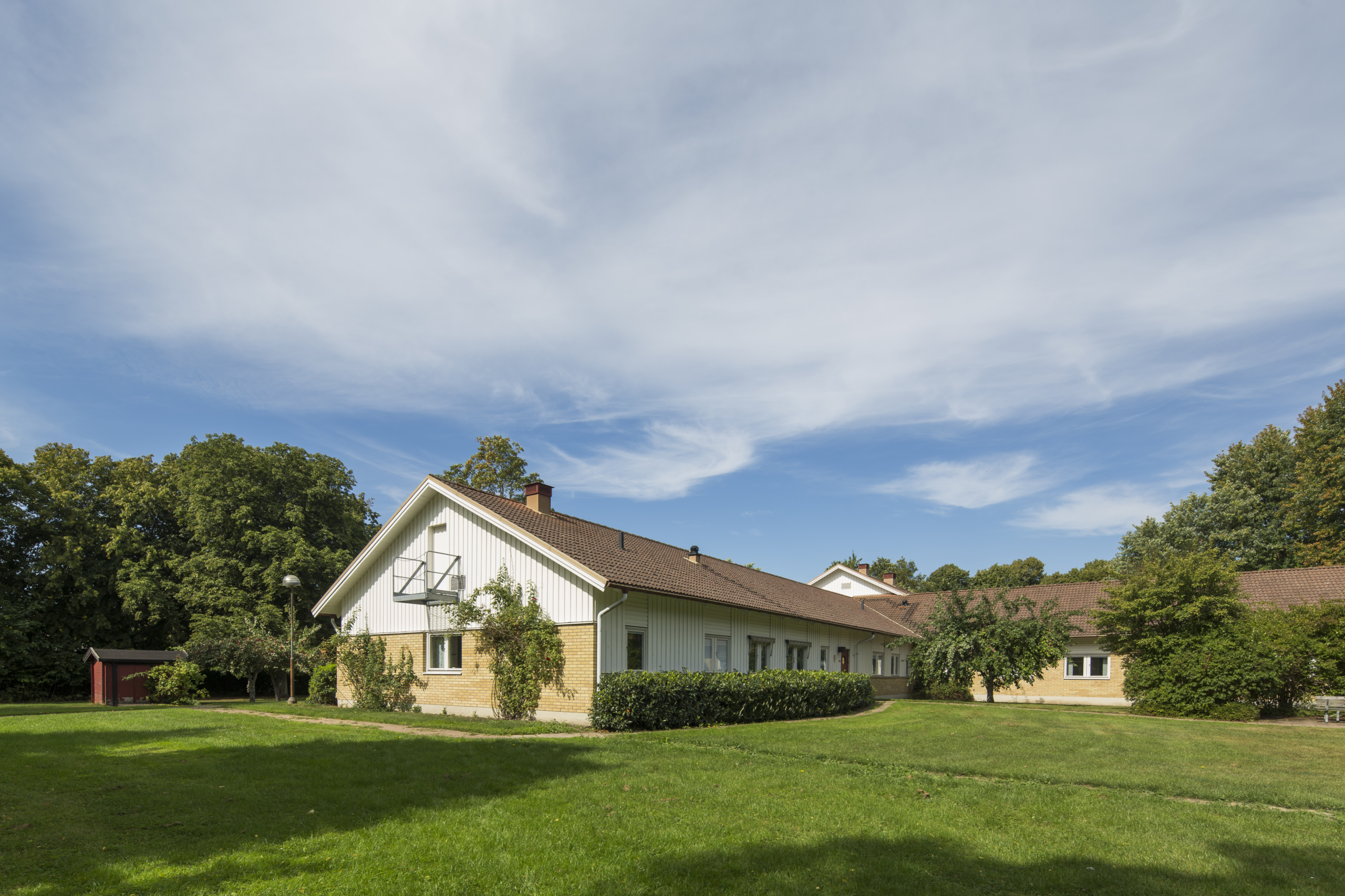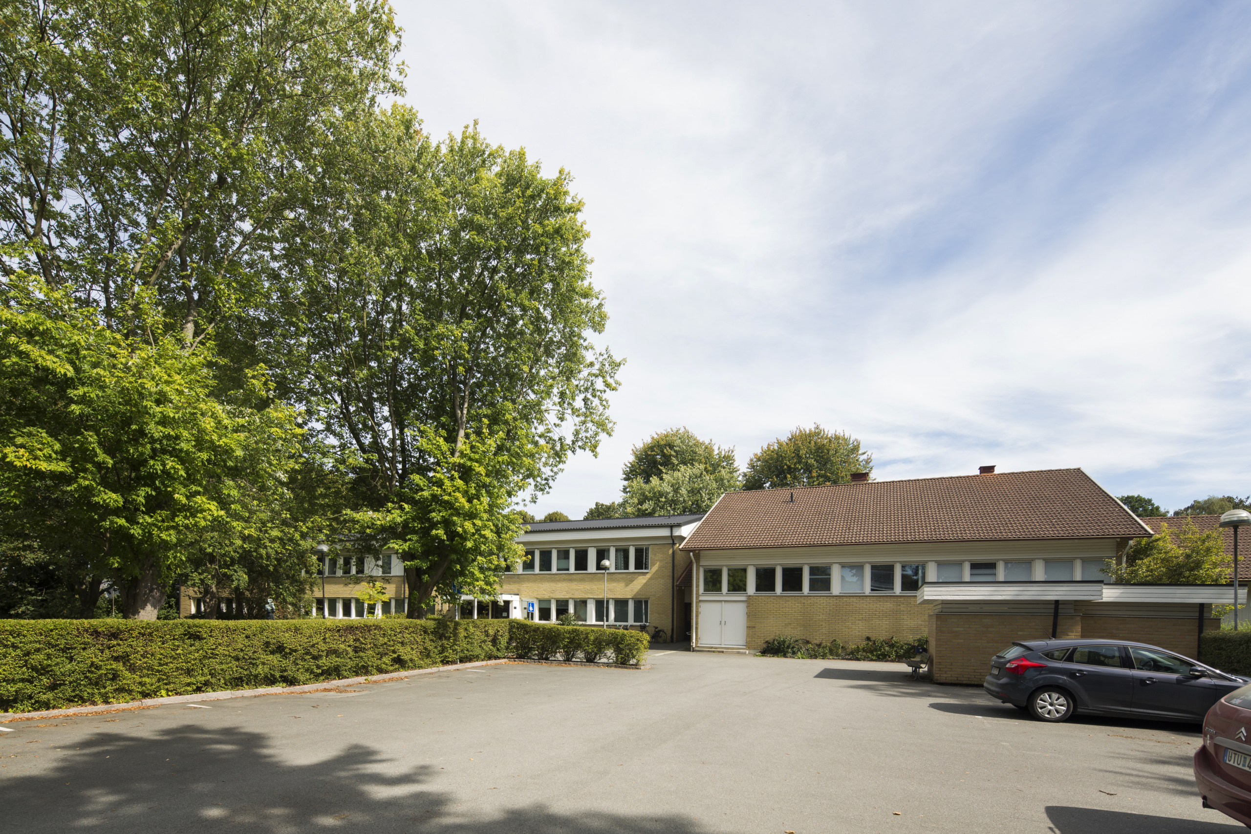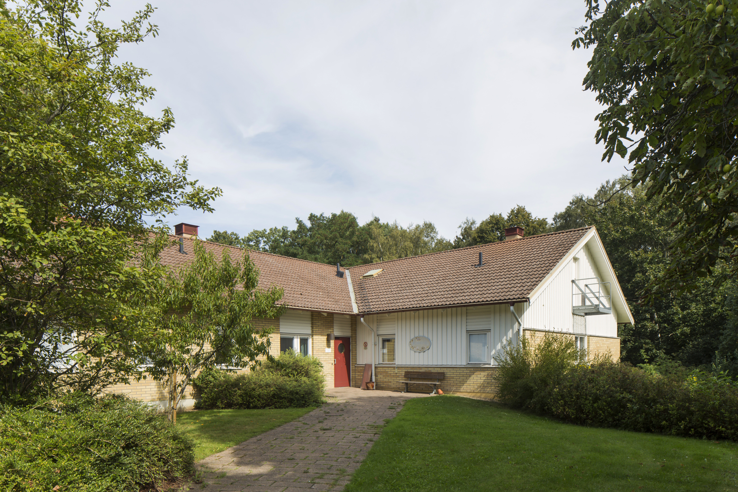 Fastigheten ligger inbäddad i grönska i anslutning till sjukhusområdet och ett bostadsområde.