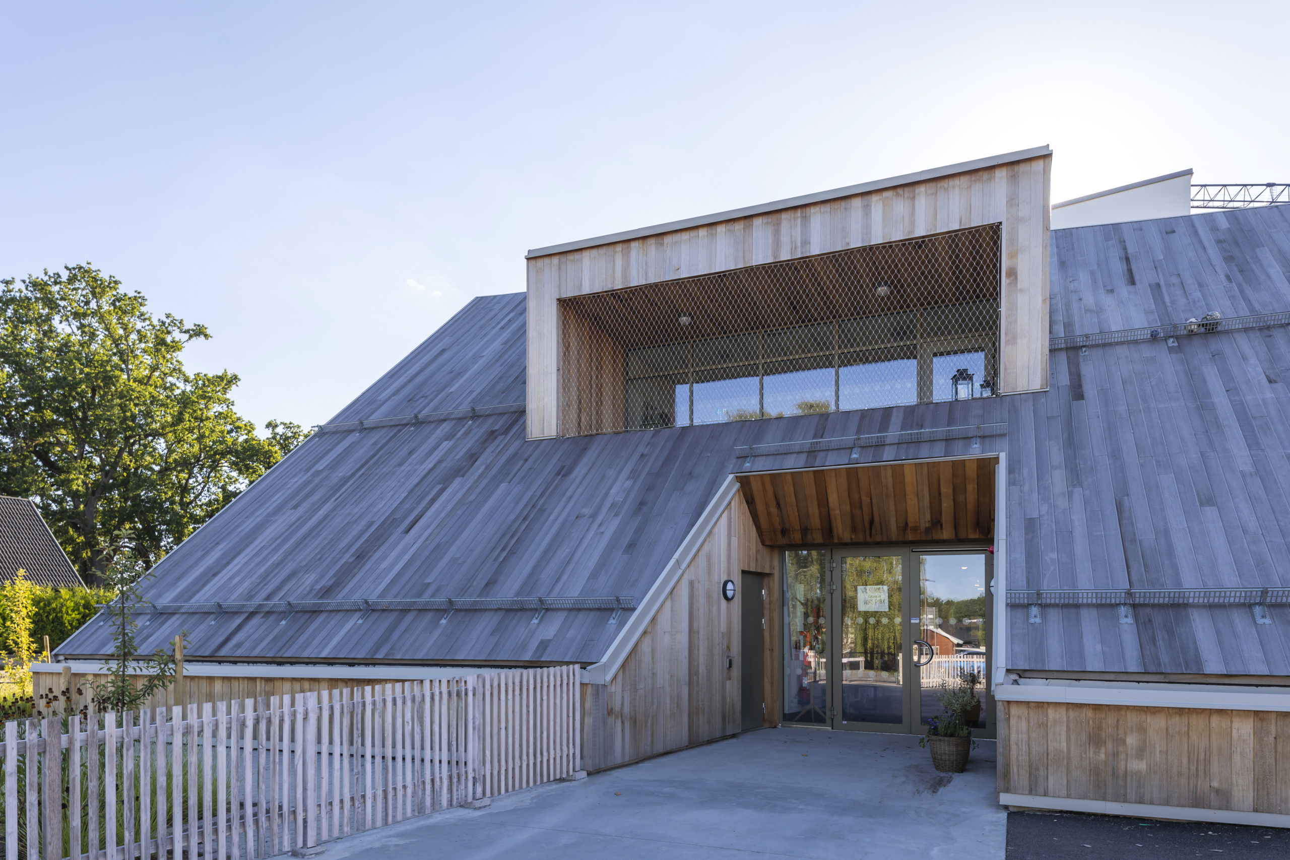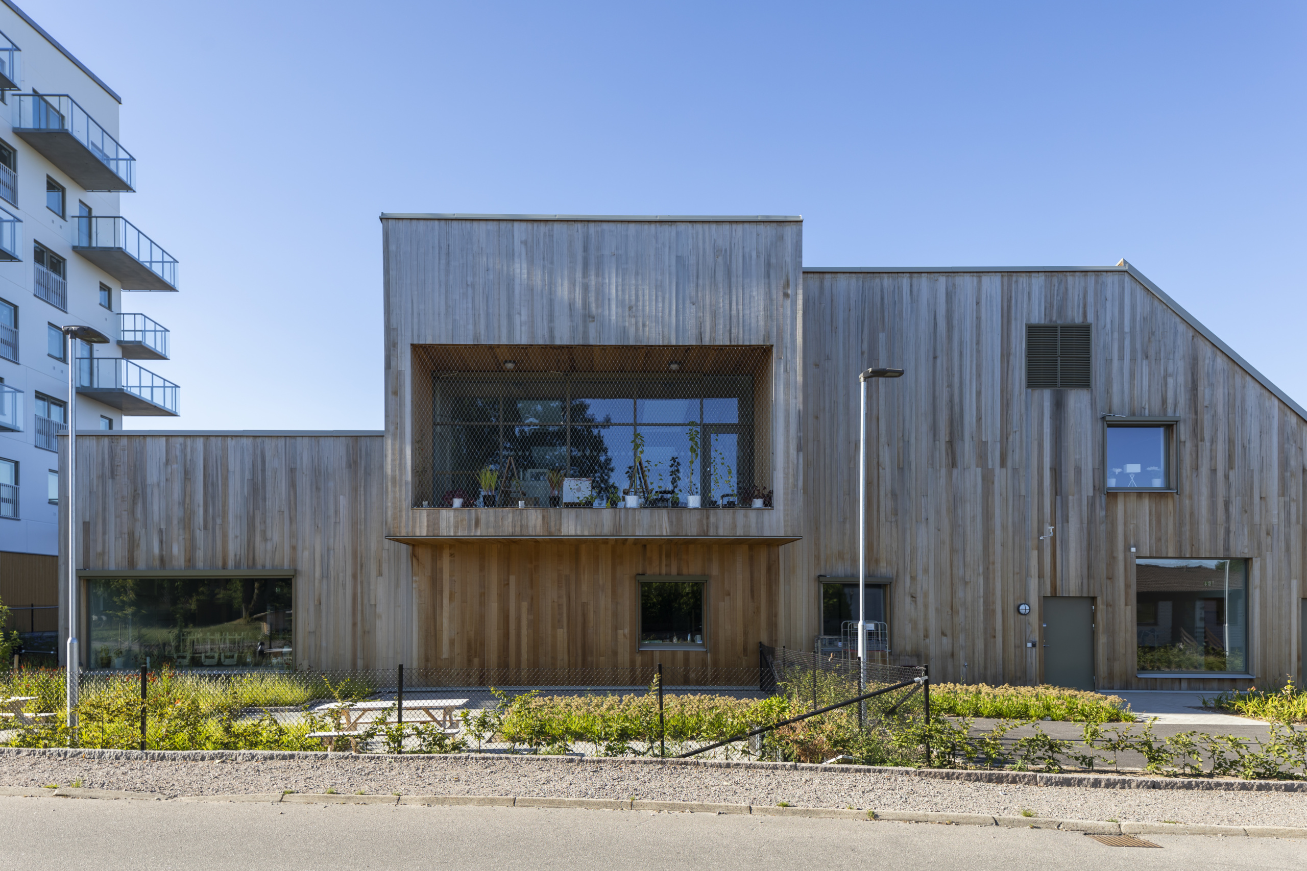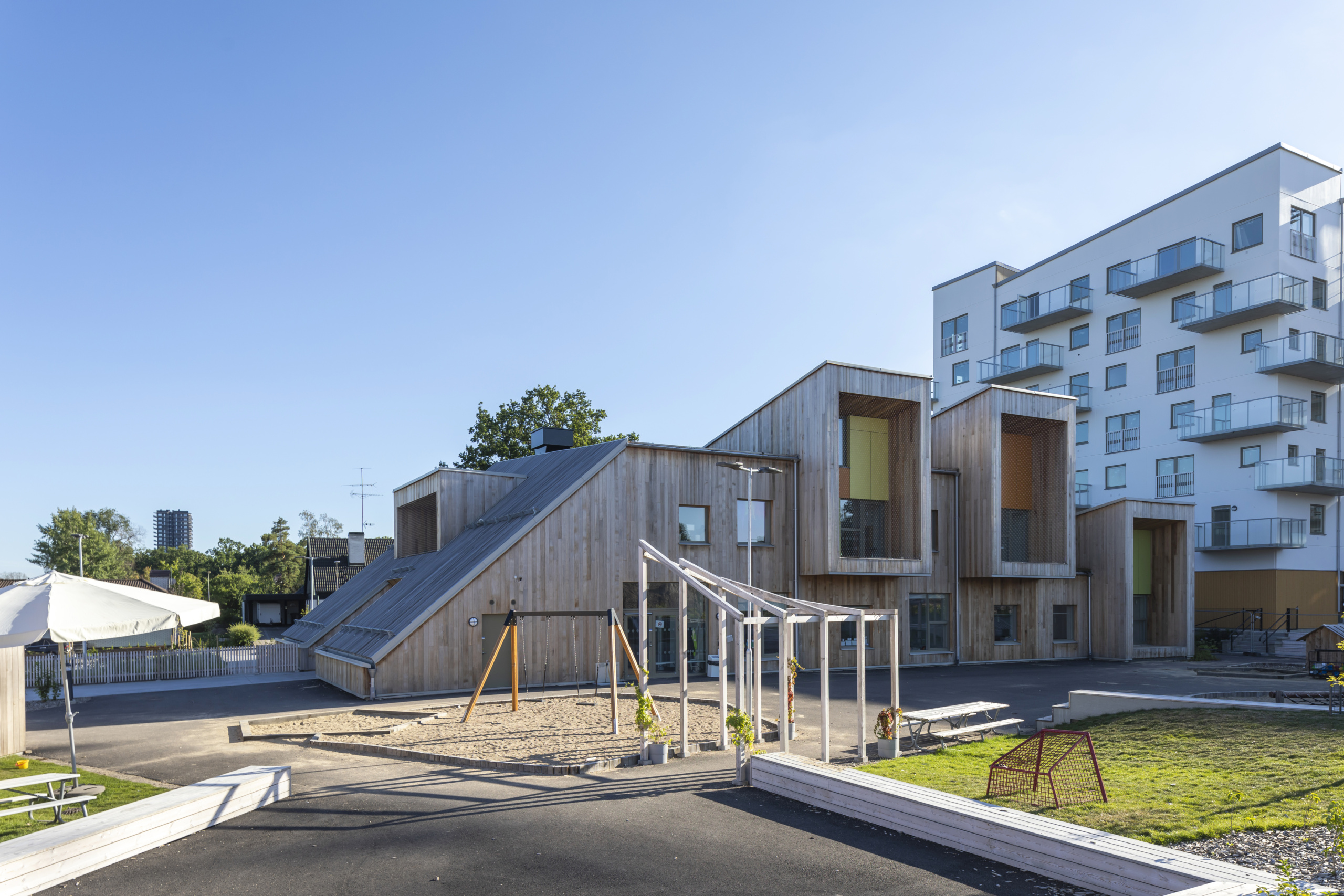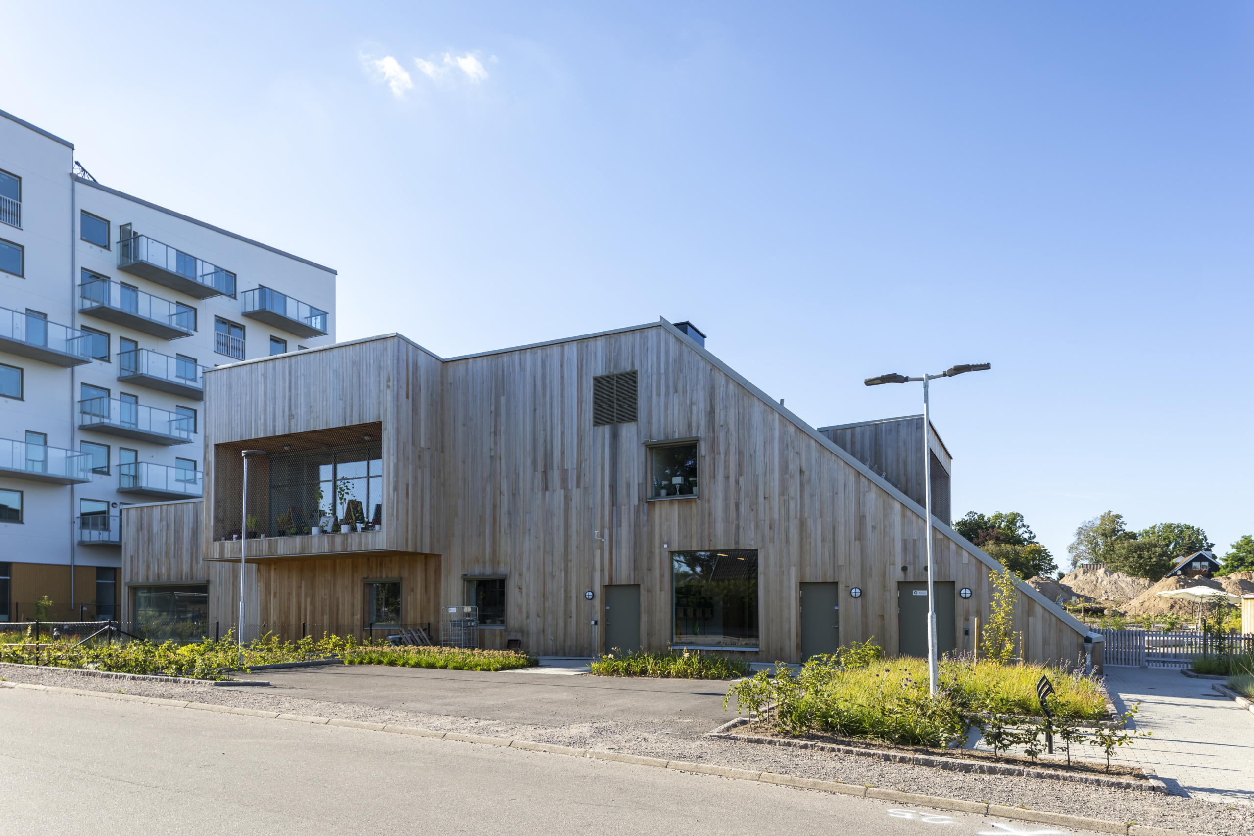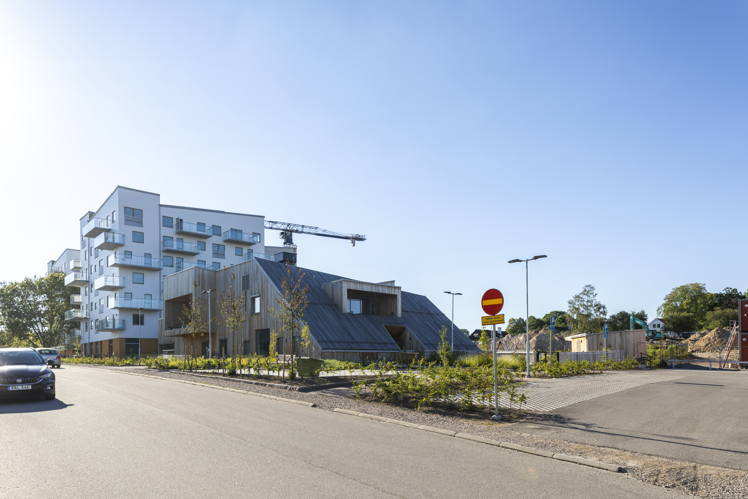 Arkitekt Joachim Lundquist har ritat huset som är uppfört 2021 och har en area om 950 kvm. Fastigheten är byggd med hållbarhet i fokus och miljöcertifierad. Sedumtaket på framsidan ger med sin gröna växtlighet huset en charmig karaktär, och de starka färgerna och skarpa vinklarna är ett annorlunda inslag i stadsbilden.